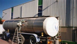 een voorbewerking voor de te coaten grondlagen,speciale lak toepassing.de tankwagen is van R.V.S. 316, wordt hierna in een epoxcie nat lak systeem gespoten , meerlaags nat lak systeem