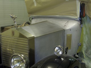 aluminium delen geheel blank gestraald; gereed voor lakbewerking, de boddy is met lage druk en een fijn straal middel schoon en spekglad gestraald. er komt nu een etsende prymerlaag over, hierna volgen nog de prymer en vullagen alsmede de laklagen, totaal 'n 7 lagen lak, DE RADIATOR VAN DEZE TWENTY IS VAN NIKKEL, CHROOM , WAS ER IN DIE TIJD NOG NIET, DE LAMELLEN ZIJN ALLEEN OP DIT TYPE AUTO DOOR ROLLS ROYCE GEMONTEERD, DIT KLEINE MODEL AUTO , de TWENTY H.P. IS UNIEK IN NEDERLAND.